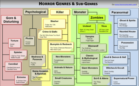 Horror ist nicht gleich Horror. Die Einteilung in Genres und Sub-Grenres hat mit der Filmindustrie Fahrt aufgenommen, eine Grafik macht die Vielfalt deutlich.